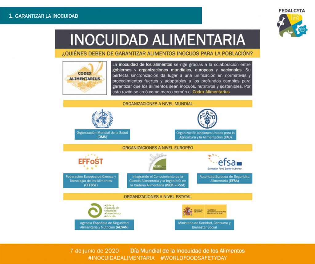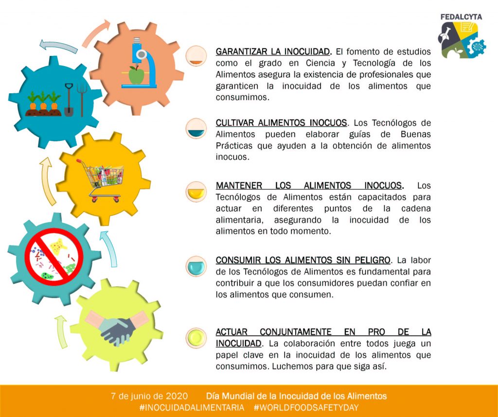 FEDALCYTA-Federación de Asociaciones de Ciencia y Tecnología de los Alimentos, con sus asociaciones miembros (ACTAE; ACYTAEX; ALTAGA; Associació Catalana de Científics i Tecnòlegs dels Aliments; ATECTA-Aragón y AVECTA) celebra hoy, 7 de junio, el Día Mundial de la Inocuidad Alimentaria 2020 (WorldFoodSafetyDay).